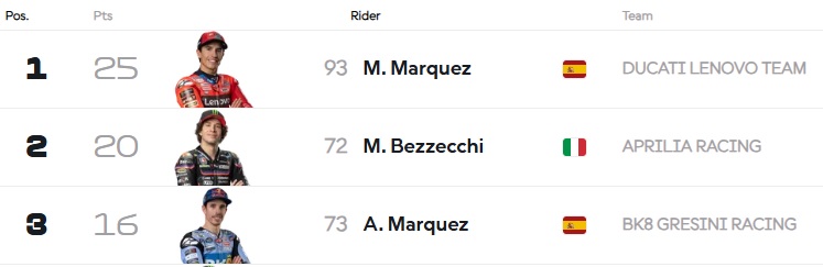 Neste domingo (14/09), após suportar a pressão constante de Marco Bezzecchi (#72), da equipe Aprilia Racing, Marc Márquez (#93), do time Ducati Lenovo, aproveitou a oportunidade que teve e passou a liderar o Grande Prêmio de Misano a partir da segunda metade da corrida. Bezzecchi havia vencido a Sprint Race no sábado, mas o piloto da moto #93 se recuperou do revés do dia anterior e cruzou a linha de chegada em primeiro na corrida principal, para ver o título da temporada 2025 da classe MotoGP ficar cada vez mais próximo das suas mãos.