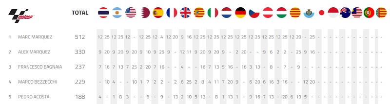 A vitória de Márquez em Misano significa que o Grande Prêmio do Japão pode consagrar o piloto espanhol novamente como Campeão Mundial, caso os resultados sejam favoráveis. O único piloto que pode impedir isso é Alex Márquez (#73), da BK8 Gresini Racing, que foi o terceiro colocado nessa 16ª rodada do Mundial.