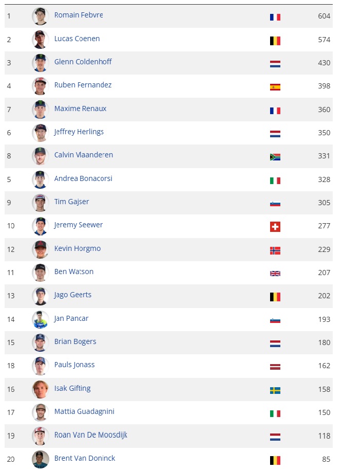 O francês Romain Febvre (#3) terminou em terceiro na primeira corrida, mas dominou a segunda bateria para conquistar sua quarta vitória em Grandes Prêmios nesta temporada pela Kawasaki Racing. Enquanto isso, Lucas Coenen (#96), da Red Bull KTM Factory Racing, ficou com o segundo lugar no geral da etapa. Já Glenn Coldenhoff (#259) retornou ao pódio, após conquistar uma vitória na primeira bateria pela Fantic Factory Racing.