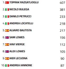 Já o italiano Nicolo Bulega (#11), da equipe Aruba.it Ducati, conteve a vantagem de pontos do líder da competição com sua sexta P2 consecutiva, enquanto na P3, o espanhol Alvaro Bautista (#19), companheiro de Bulega na Aruba.it Ducati) ficou com o terceiro degrau do pódio.